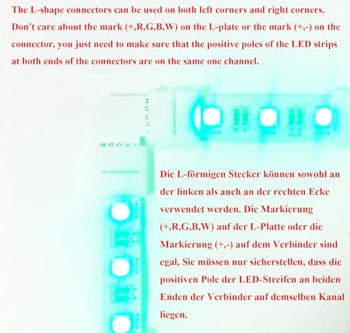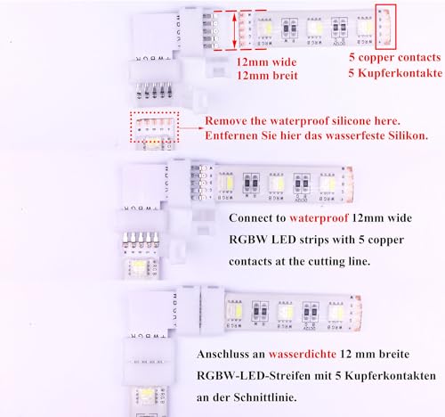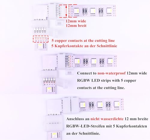 Questi connettori angolari sono adatti solo per strisce LED RGBW larghe 12mm con 5 contatti in rame su ogni linea di taglio, ad esempio strisce LED SMD 5050 RGBW larghe 12mm. NOTA: questi attacchi rapidi NON sono adatti alle strisce LED RGBW da 10mm di larghezza.