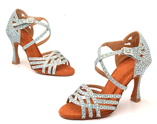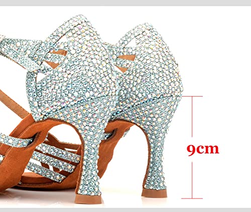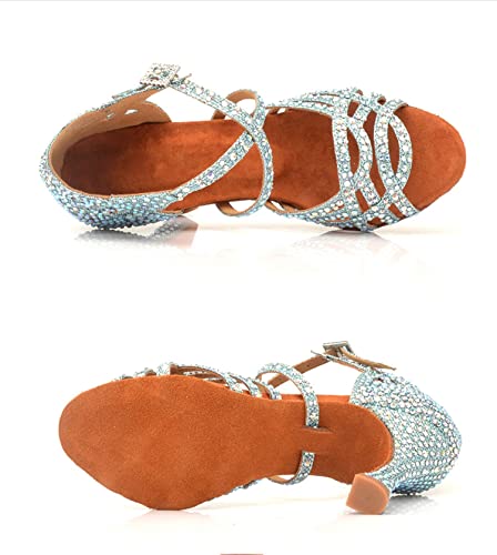 LITNERMIA Donne Peep Toe Borchiati Strass Festa di Nozze Sandali Tango Latino Scarpe da Ballo, Un Tacco Glitterato Azzurro 9 cm, 35.5 EU