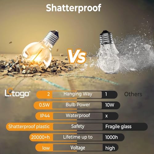 【Risparmio energetico】Ogni lampadina LED da 0.5W può sostituire una lampadina al tungsteno da 7W. Litogo catena luci esterno risparmiare la bolletta della luce con la stessa luminosità. Le lampadine a LED generano meno calore e durano più a lungo delle lampadine al tungsteno. Tempo di illuminazione lungo potrebbe ridurre i costi di manutenzione e aiutarti a risparmiare bolletta elettrica.