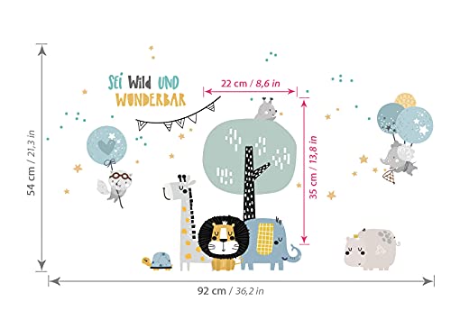 Contenuto della confezione: un adesivo da parete con scritta in lingua inglese "Safariity" e scritta, l'immagine corrisponde a 92 x 54 cm e l'albero ha una dimensione di 22 x 35 cm (larghezza x altezza). Per un'applicazione senza stress forniamo istruzioni per l'applicazione e un adesivo di prova.