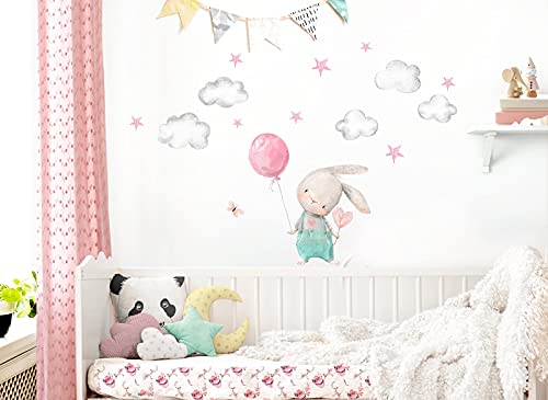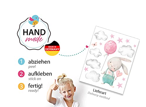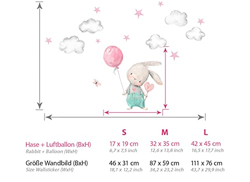 Contenuto della confezione: un adesivo da parete con coniglietto e palloncino, l'immagine corrisponde a 46 x 31 cm e il coniglietto con palloncino ha una dimensione di 17 x 19 cm (larghezza x altezza), con istruzioni per l'applicazione facilissima e un adesivo di prova.