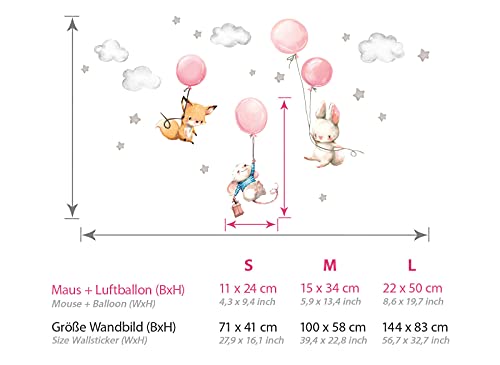 Contenuto della confezione: un adesivo da parete con volpe e coniglietto con palloncino, l'immagine corrisponde a 144 x 83 cm e il topolino con palloncino ha una dimensione di 22 x 50 cm (larghezza x altezza), con istruzioni per un'applicazione facile e un adesivo di prova.