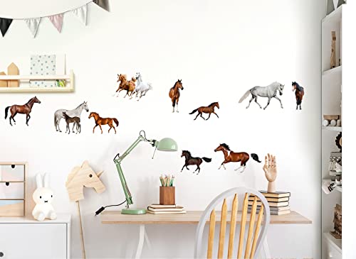 Contenuto della confezione: un adesivo da parete con cavalli, l'immagine corrisponde a 132 x 47 cm e i due cavalli hanno una dimensione di 15 x 14 cm (larghezza x altezza), con istruzioni per un'applicazione facile e un adesivo di prova.