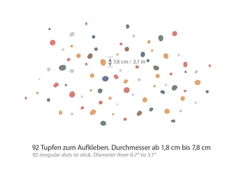 Contenuto della confezione: 92 pois di colore rosso, giallo, blu su quattro fogli A4, con semplici istruzioni (lingua italiana non garantita) per l'applicazione sulla parete e un adesivo per effettuare una prova.
