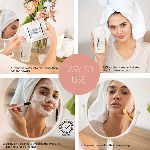 Divertente e facile da usare. Versare la quantità di acqua indicata sulla confezione della maschera nello shaker e poi aggiungere il sacchetto di polvere. Chiudere lo shaker e agitare energicamente per pochi secondi fino al “silenzio” del composto. Applicare immediatamente il composto sul viso evitando il contorno occhi. Lasciare in posa circa 10 minuti. Rimuovere la maschera con l'aiuto di una spugna umida.