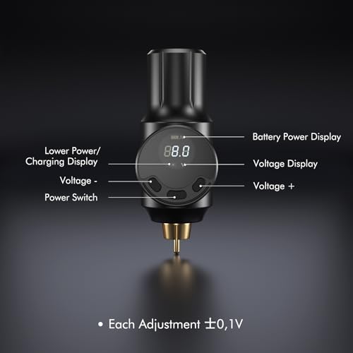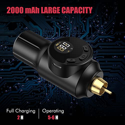【Batteria senza fili da 2000 mAh】 La batteria cordless da 2000mAh ha una grande capacità con dimensioni ridotte. Si ricarica per 2 ore e dura 5-6 ore, a seconda del voltaggio e del motore. Compatibile con tutte le macchine per tatuaggi rotanti RCA standard. Gli artisti del tatuaggio possono liberarsi del problema del cablaggio della macchinetta e concentrarsi sulla creazione dei tatuaggi.