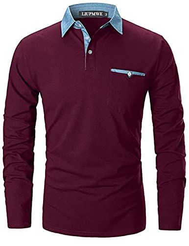 LIUPMWE Polo Uomo Manica Lunga Maglietta Cuciture in Denim Collare Cotone Basic Golf Casual T-Shirt,a-Rosso,XL