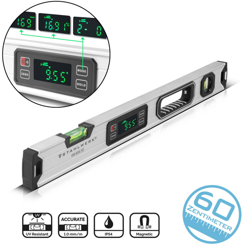 Caratteristiche Indispensabile in cantiere, per i lavori di ristrutturazione, in officina o in casa, la livella digitale STAHLWERK convince per l'estrema precisione delle misure. La livella, lunga 600 mm, è dotata di una livella orizzontale e una verticale e i valori misurati possono essere comodamente letti su un chiaro display a LED illuminato. Un display a freccia a LED aiuta a livellare con precisione in orizzontale, verticale o diagonale (0° / 45° / 90°). È possibile aggiungere un segnale acustico come opzione. Una pratica funzione di mantenimento permette di mantenere e riprodurre l'angolo desiderato, mentre il pulsante di azzeramento consente di calibrare in loco in base alle esigenze individuali. I valori misurati possono essere visualizzati in gradi, per cento, mm/m e IN/FT. Per le misure dall'alto, il display ruota automaticamente di 180° per garantire sempre una leggibilità ottimale. L'inclinometro è dotato di una funzione di spegnimento automatico che spegne il dispositivo