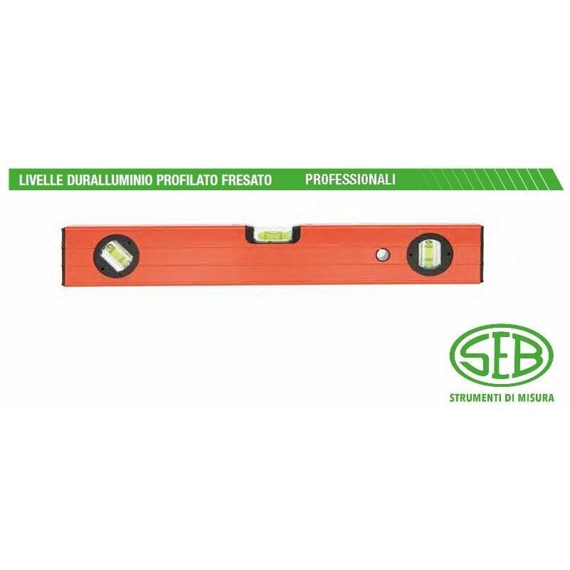 LIVELLA IN DURALLUMINIO PROFESSIONALE 40 CM SEB Livella in duralluminio profilato fresato, 40 cm. Caratteristiche Profilato pesante in alluminio verniciato Sezione: 25 x 60 mm Lunghezza: 40 cm Tre fiale a doppio tratto in materiale acrilico antichoc Fiale regolabili Precisione 1,8/m mm Per uso professionale