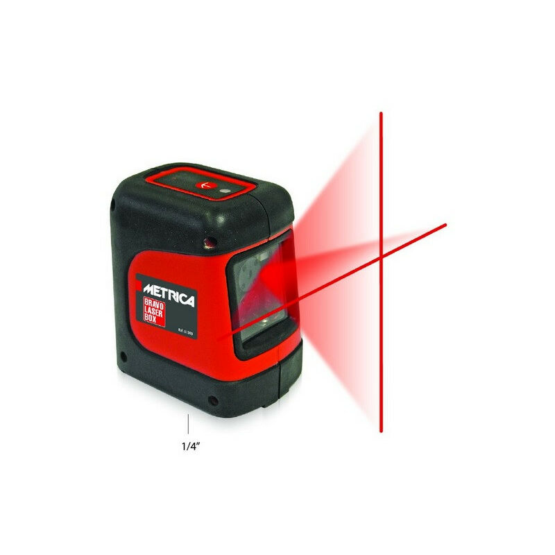Metrica - Livella laser autolivellante, portata 10 m IP43 - LASERBOX - Laser autolivellante: proietta un piano rosso autolivellante verticale e/o orizzontale per uso interno - Lampeggiamento automatico del laser quando il dispositivo è fuori dal campo di autolivellamento - Design compatto, paraurti in gomma antiscivolo Specifiche tecniche: Portata: 10 m Precisione di livellamento: +/- 2mm - 5m Gamma di autolivellamento: +/- 4°. Segnale non autolivellante: luce lampeggiante Tipo di laser: 635 nm Potenza del laser: Classe II Impermeabilità: IP 43 Batterie: 2 x 1.5V AA alcaline Dimensioni: 82 x 57 x 90 mm Peso senza batterie: 0,36 kg Filetto per treppiede: 1/4. 2 anni di garanzia