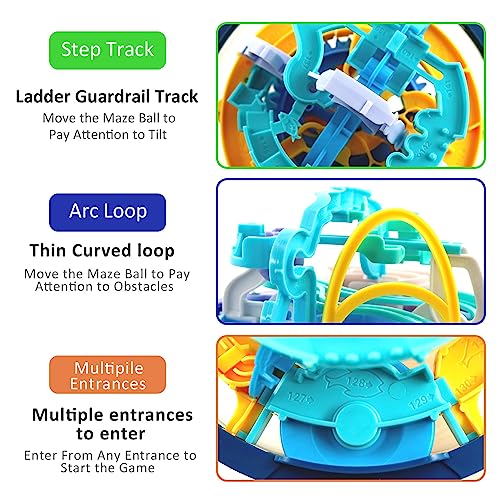 【Ostacoli impegnativi】Le regole sono molto semplici. Ruotare la palla di 360° e fare in modo che la palla rimanga sulla pista fino al punto di gioco successivo. Perseveranza, pensiero spaziale e abilità sono le chiavi del successo. Nota: assicurarsi che il giocattolo non cada da un punto alto.