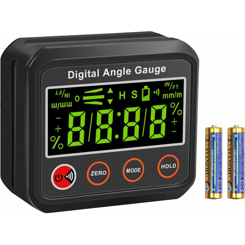 Fondo con scanalatura a V magnetica - Questa scatola di livello ha una scanalatura a V magnetica sul fondo, che consente di fissarla rapidamente e facilmente al tavolo della sega, alle seghe a nastro, alle barre di metallo e persino ai tubi tondi. C'è una scanalatura su 2 lati della custodia per un facile lavoro di marcatura. 【Schermo LED più luminoso e più grande】 Tecnologia LED aggiornata per il display più luminoso e dispone di uno schermo grande (5 * 2,5 cm). È più facile e chiaro leggere i valori anche di notte. Inoltre, lo schermo LCD potrebbe indicare che la batteria è scarica. 【Design suoneria udibile】Con funzione di sveglia. Il cicalino avverte quando si trova entro +/- 1° dalla posizione orizzontale o verticale. Adatto per il livellamento. 【Data Hold e Zero Reset】 La funzione Data Hold e Zero Reset consente misurazioni accurate di angoli, smussi e pendenze assoluti E relativi su qualsiasi superficie immaginabile. 【Automatico Spegnimento: alimentato da 2 batterie AAA
