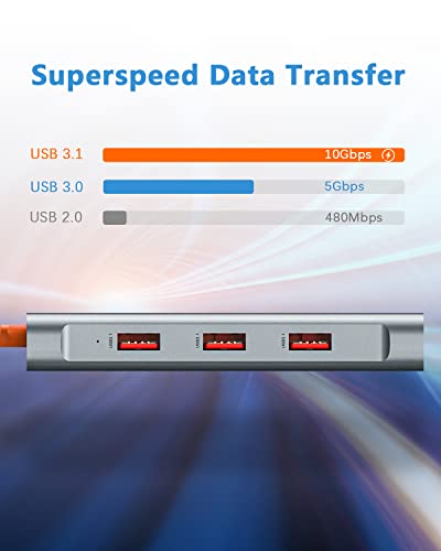 [USB 3.1 Gen2] L'hub USB C di livello superiore è dotato di 4 porte USB C 3.1 Gen2, ciascuna porta ha una velocità di trasferimento dati fino a 10 Gbps. 20 volte più veloce di USB 2.0 convenzionale, 2 volte più veloce di USB 3.0. Trasferisci istantaneamente foto, brani e filmati.