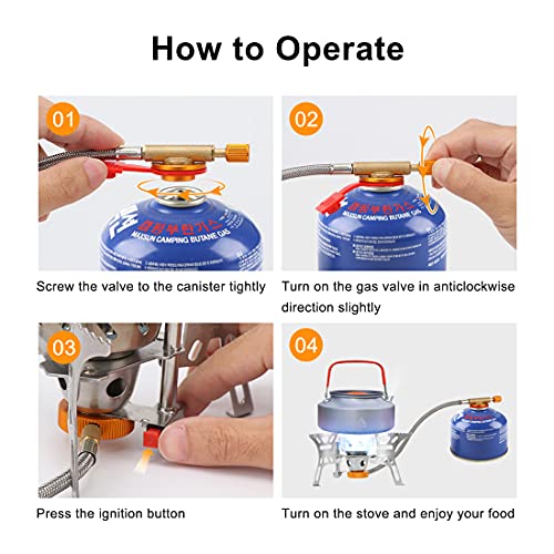 【Facile da accendere e regolare】 La stufa da viaggio è dotata di accensione piezoelettrica in ceramica, che può facilmente accendere la fiamma senza alcuna pietra focaia aggiuntiva. La valvola di controllo della fiamma incorporata nel mini fornello da campeggio consente inoltre di regolare la potenza di fuoco in base alle esigenze. ✘ Nota: la bombola e il convertitore dell'adattatore del gas non sono inclusi.