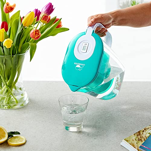 LIVEWATER discovery caraffa extra large per filtro dell'acqua per frigorifero per ridurre cloro, calcare e impurità, include 1 cartuccia filtrante, 4.2L turchese. Senza BPA. Standard NSF/ANSI/TUV.