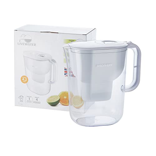 LIVEWATER discovery caraffa extra large per filtro dell'acqua per frigorifero per ridurre cloro, calcare e impurità, include 1 cartuccia filtrante, 4.2L- bianco.BPA free.NSF/ANSI/TUV standard.