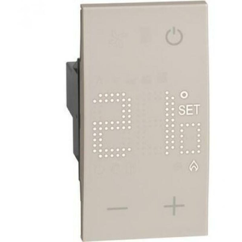BTICINO KM4441 Questo termostato con display retroilluminato è stato pensato per il controllo della temperatura dell'ambiante di un'abitazione, un ufficio, ecc... Questo termostato è dotato di un'uscita a relè con un contatto in deviazione libero da potenziale 5 (2) A. Questo termostato necessita di un'alimentazione di 230Va.c. (standard per uso domestico. Questo termostato occupa due modu li della placca, ma a differenza di quasi tutti gli altri accessori elettrici della stessa serie, non bisogna coprirlo con una cover. Questa linea è stata studiata per adattarsi a qualsiasi casa, ad impianti vecchi e nuovi, anche se in quelli nuovi si possono usare tutte le funzionalità smart della serie. L'installazione è semplice ma del tutto nuova, infatti il colpo d'occhio suggerisce la mancanza della placca, in realtà la placca è presente ma nascosta dalle cover degli accessori appunto. Installando i prodotti di questa serie potrai dare un aspetto moderno ed originale alla tua casa. Il