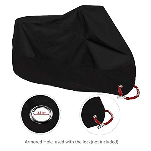 Custodia per moto: progettata con fori di bloccaggio nella parte inferiore della parte anteriore della copertina. Design con scanalatura di sicurezza (3,8 cm di diametro), aiuta a stabilizzare la copertura e può bloccare il cofano moto e auto insieme, proteggere efficacemente la tua moto.