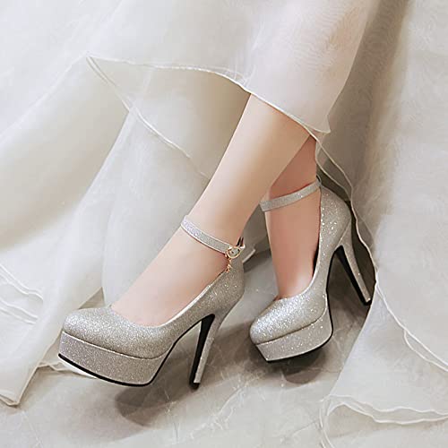 Lizoleor Bride Vestito Tacco A Spillo con Cinturino alla Caviglia Sposa Plateau Scarpe Punta Rotonda Eleganti Tacco Alto Donna Prom Serata Scarpe Argento Numero 32 EU