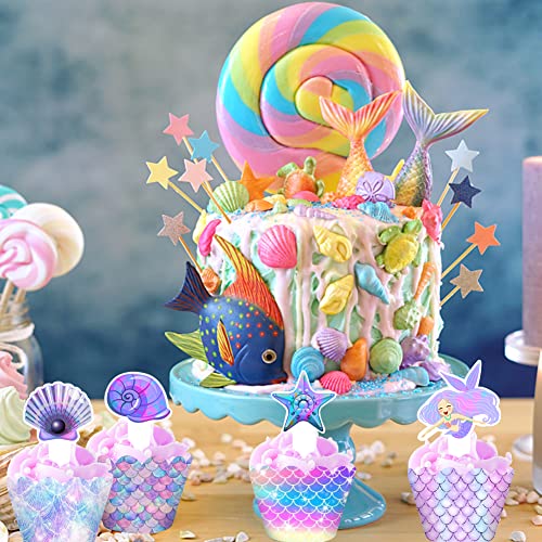 LKNBIF Decorazione Torta Sirena, 32 Pezzi Sirena Topper Torta + 32 Pezzi Sirena Cupcake Wrapper, Decorazione Torta Sirena per Sirena Feste Tema di Compleanno Decorazioni