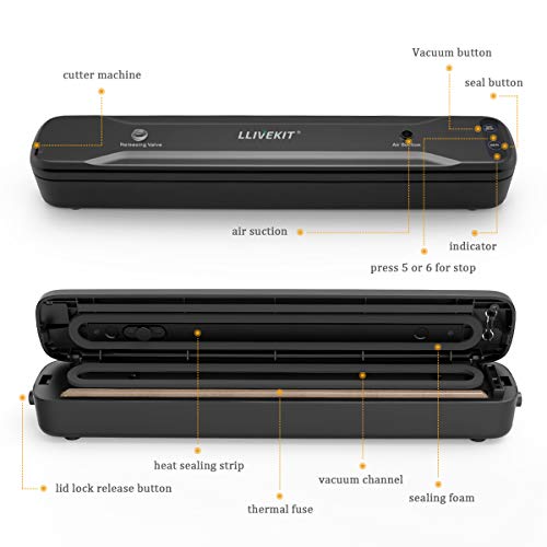 Llivekit Macchina Sottovuoto per Alimenti,Automatica Portatile Vacuum Sealer,Kit di Avviamento Gratuito 10 Sacchetti+ 1 Tubo Accessorio/Nero