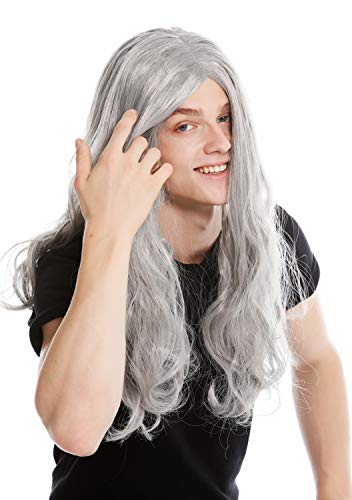 WIG ME UP - LM155-ZA68E Parrucca Uomo Donna Lunga Scompigliata Riga in Mezzo Heavy Metal Vecchio Rocker Hippy Grigio