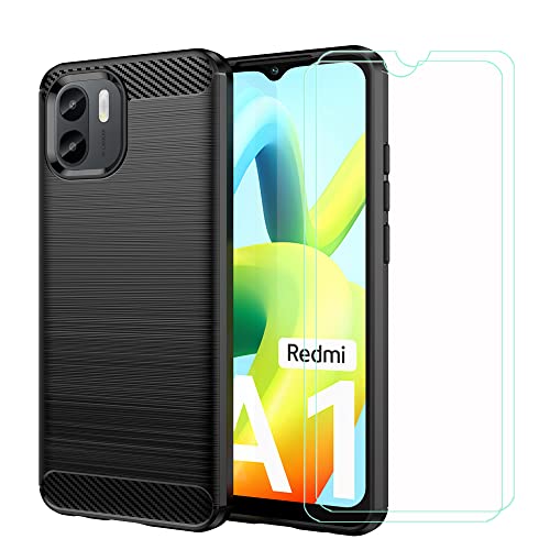 LMLQSZ Custodia per Redmi A1, Morbido TPU Fibra di Carbonio Case Gel Sottile Cover + 2 Pellicola Protettiva in Vetro Temperato per Redmi A1 (6,52") - Nero