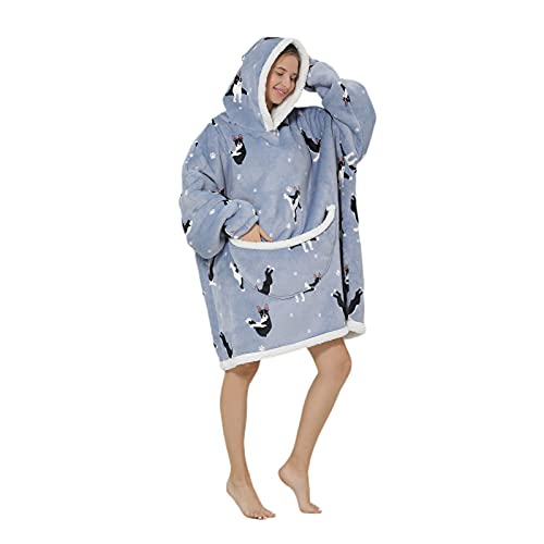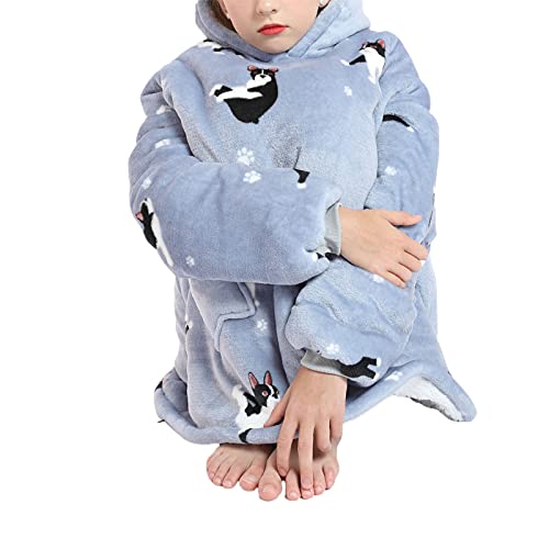 Loalirando Coperta Felpa con Cappuccio Oversize Coperta in Soffice Pile per Mamma e Ragazzi Bambini Coperta con Cappuccio Indossabile Abbinamento Familiare (Blu Grigio-Cani, Taglia Unica)