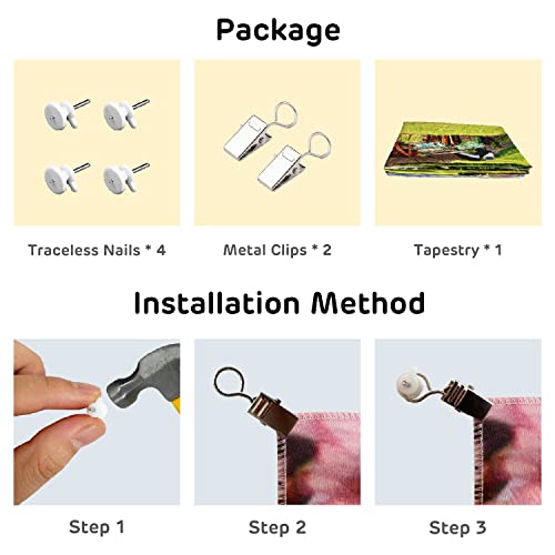 La confezione include 1 arazzo, 4-6 unghie senza cuciture, 2 clip, che possono aiutarti a appendere facilmente. Il design non traccia lascerà fori più piccoli e meno danni alla parete.