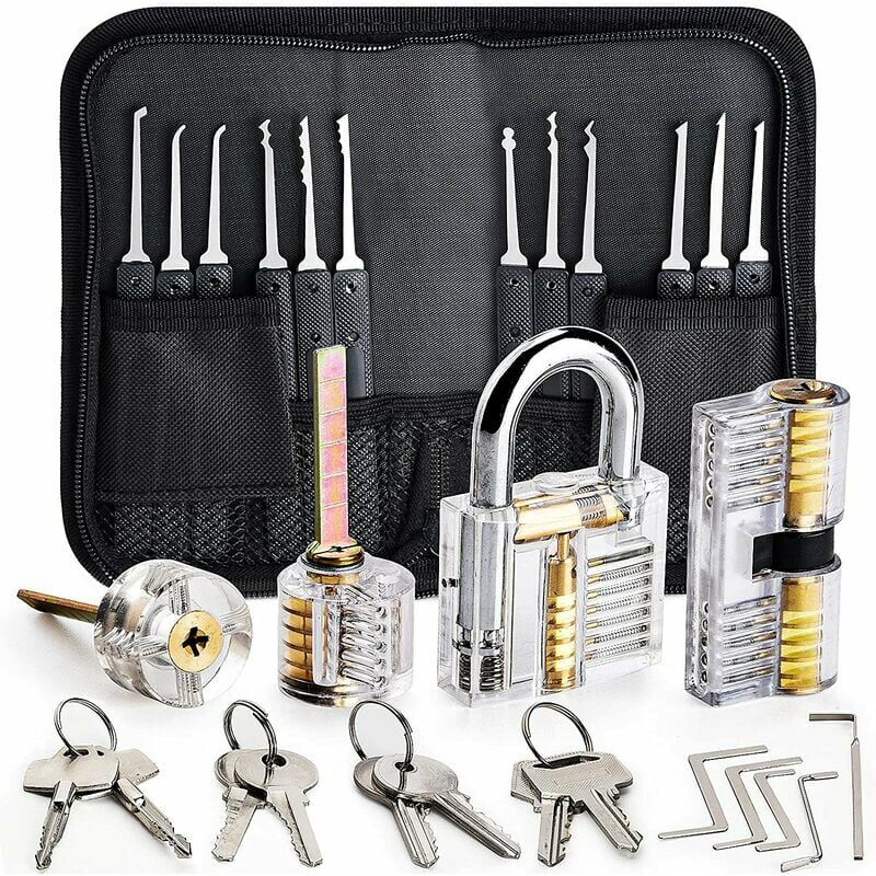 26 pezzi. Set di grimaldelli con 4 ganci trasparenti per le dita e grimaldelli professionale. Grazie ai materiali trasparenti, il meccanismo all'interno della serratura è di facile comprensione. 4 lame con 4 diversi livelli di difficoltà, diversi colpi migliorano l'effetto di base. Ci sono molti diversi strumenti di manipolazione per diversi tipi di serrature. Una volta girata, la chiave si apre in pochi secondi. Se ami scassinare serrature e vuoi impostare un nuovo orario, questo kit è l'ideale per te.