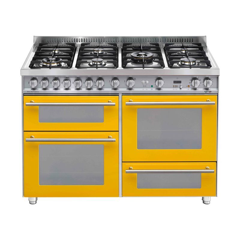 Lofra PG126SMFET+DMFT/2AEO. Tipo di prodotto: Cucina freestanding, Colore del prodotto: Acciaio inossidabile, Giallo, Tipo di controllo: Pulsanti, Manopola. Tipo di piano cottura: Gas, Numero totale di fuochi: 7 Fornello(i), Numero di fuochi: 7 Fornello(i). Dimensione del forno: Media, Sorgente di alimentazione del forno: Elettrico, Capacità netta del forno: 72 L. Dimensione del forno 2: Piccola, Fonte di alimentazione del forno 2: Elettrico, Capacità netta del forno 2: 42 L. Dimensione del forno 3: Media, Fonte di alimentazione del forno 3: Elettrico, Capacità netta del forno 3: 72 L Design Tipo di prodotto Cucina freestanding Colore del prodotto Acciaio inossidabile, Giallo Colore del manico Acciaio inossidabile Tipo di controllo Pulsanti, Manopola Posizione di controllo Frontale superiore Display incorporato Sì Vano portaoggetti Sì Certificazione CE Fornello Tipo di piano cottura Gas Numero totale di fuochi 7 Fornello(i) Numero di fuochi 7 Fornello(i) Fonte di alimentazione del