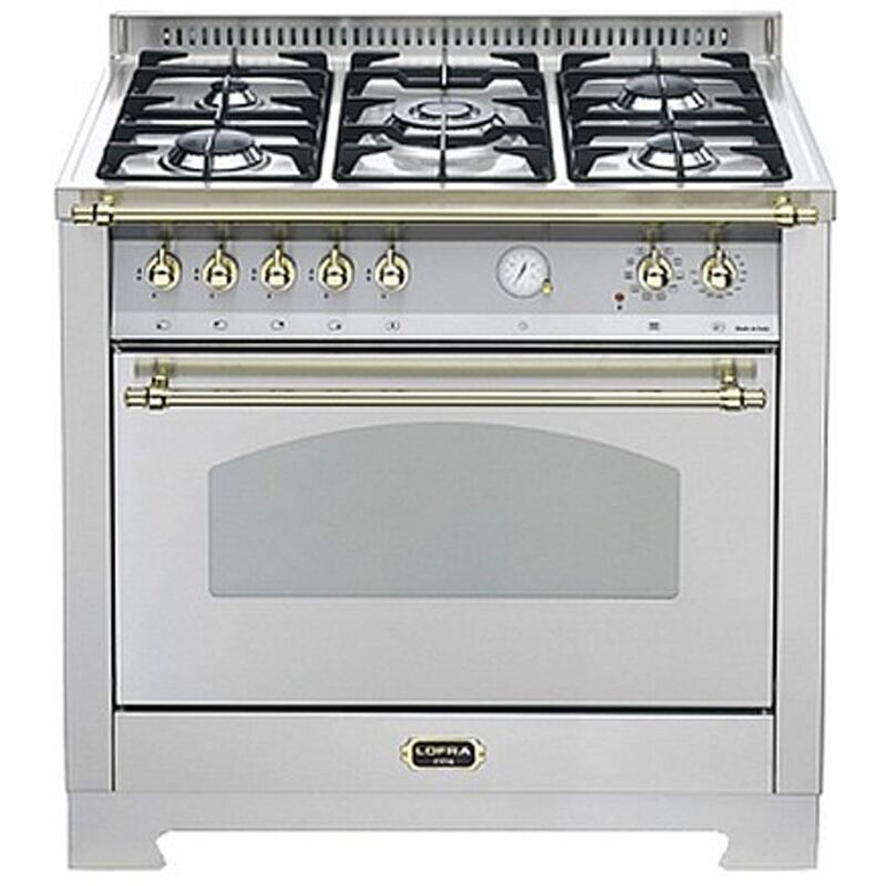 Piano cottura - finitura acciaio inox satinato - 5 fuochi a gas valvolati III Serie di cui 1 tripla corona - accensione elettronica integrata alla manopola - protezione totale Gas-Stop - griglie in ghisa Forno - multifunzione elettrico a 9 programmi - capacità 94 lt - grill elettrico - orologio di inizio e fine cottura - porta con 3 vetri di cui 2 riflettenti per una minore dispersione di calore - vetri interni della porta asportabili per facilitarne la pulizia - guide forno estraibili - ventola tangenziale per raffreddamento cruscotto - smaltatura forno easy to clean - piedini regolabili in altezza e in profondità e zoccolo di serie - con zoccolo montato altezza 90 cm Lofra RSG96MFTE/CI. Tipo di prodotto: Piano cottura, Colore del prodotto: Acciaio inossidabile, Tipo di controllo: Manopola. Tipo di piano cottura: Gas, Posizione bruciatore per padella wok: Centro, Materiale di supporto della pentola: Ghisa. Dimensione del forno: Largo, Sorgente di alimentazione del forno: Elettrico