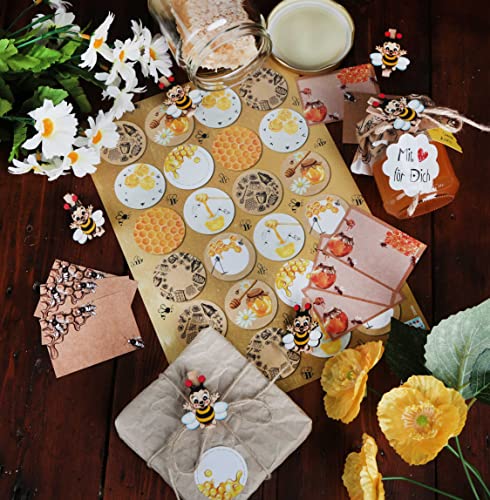 Le etichette sono una bella decorazione per vasetti di miele, imballaggi per prodotti come salviette di cera d'api o candele di cera d'api e altri prodotti per apicoltura. Gli adesivi per miele sono scrivibili con una penna a sfera.
