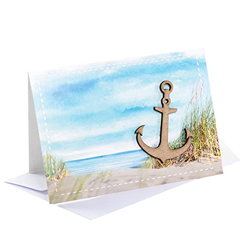 Biglietti di auguri di alta qualità in look marittimo decorati con un'ancora in legno di produzione propria.