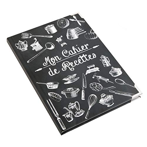 Bellissimo piccolo ricettario con un sacco di spazio per le tue ricette preferite dalla Francia e da tutto il mondo. Titolo francese IL MIO CAHIER DI RICETTE Copertura in bianco e nero con decorazione di utensili da cucina.