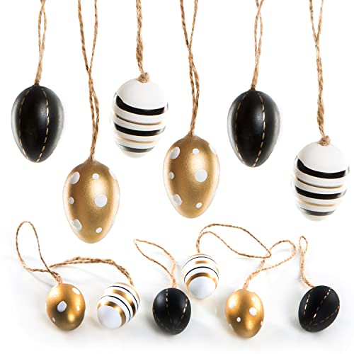 Logbuch-Verlag - 12 mini uova di Pasqua in plastica, 4 cm, bianco nero oro, uova pasquali con corda per appenderle