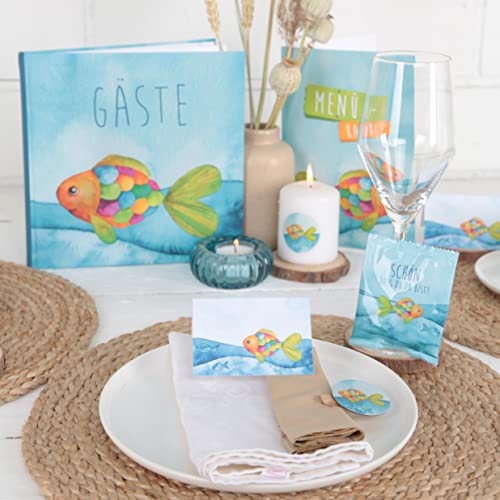 25 segnaposto o targhette stabili di alta qualità con un allegro pesciolino, un pesce arcobaleno che nuota nel mare. I biglietti con il piccolo animaletto marino sono in formato 8,5 cm x 5,5 cm - piegati. Le targhette sono scrivibili con ogni tipo di penna o pennarello.