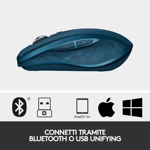Logitech MX Anywhere 2S Mouse Wireless, Multidispositivo, Bluetooth o 2.4 GHz Wireless con Ricevitore USB Unifying, 4000 DPI su Ogni Superficie, 7 Pulsanti, Ricaricabile, PC/Mac/Laptop/iPadOS, Blu