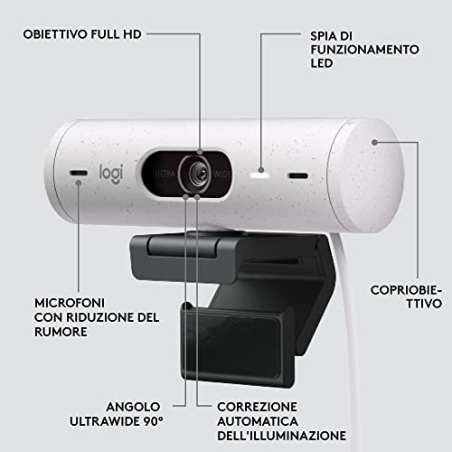 Logitech Brio 500 Webcam Full HD Correzione Luce, Show Mode, Microfono Riduzione del Rumore, Copertura Privacy, Streaming, Funziona con Microsoft Teams, Google Meet, Zoom, Cavo USB-C - Bianco