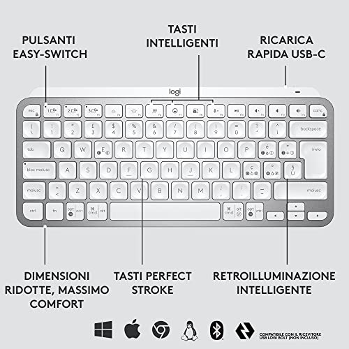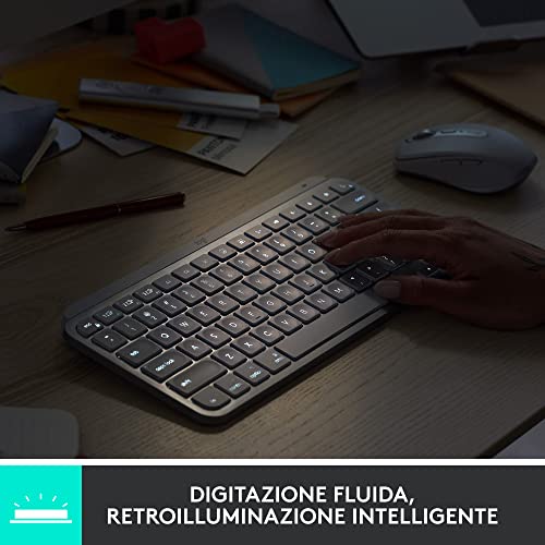 Illuminazione intelligente: la tastiera wireless MX Keys Mini è dotata di tasti retroilluminati che si illuminano nel momento in cui le mani si avvicinano e si adattano automaticamente all'ambiente