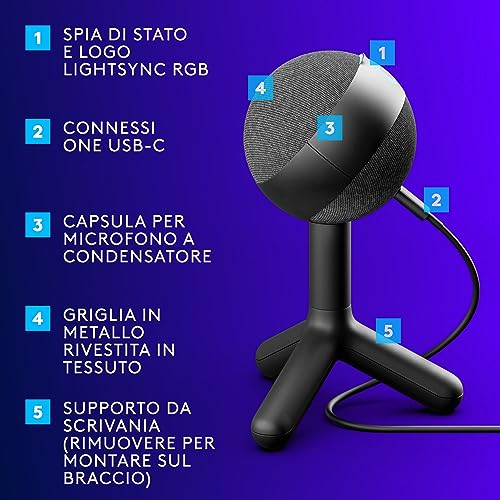 Logitech G Yeti Orb Microfono a Condensatore RGB per Gaming con LIGHTSYNC, Microfono USB per Streaming, Cardioide, Plug and Play USB per PC e Mac, Nero