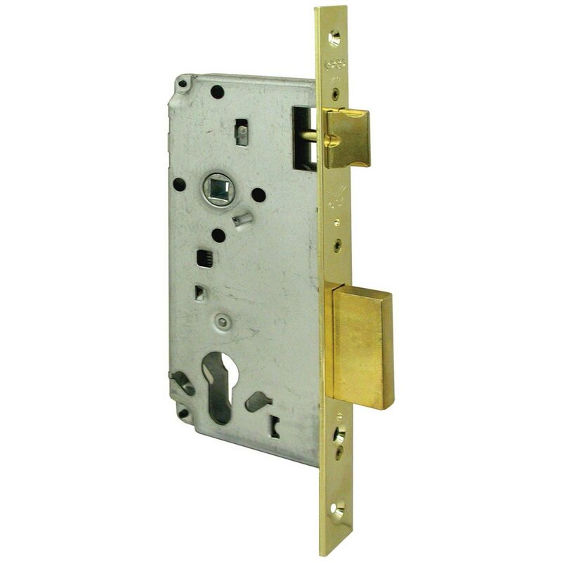 Bordo quadro. scrocco revesibile biconico, scatola acciaio, frontale e contropiastra in acciaio ottonato. catenaccio 2 mandate. frontale 22 mm, interasse 85 mm. dotazione: contropiastra, viti. senza cilindro.e 35