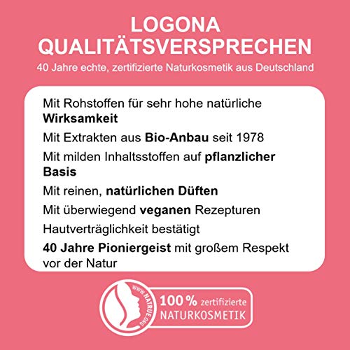 LOGONA di natura bella. Per quasi 40 anni di esperienza nel campo dei cosmetici naturali. Cosmetico naturale certificato NATRUE con estratti vegetali biologici. Produzione propria in Germania.