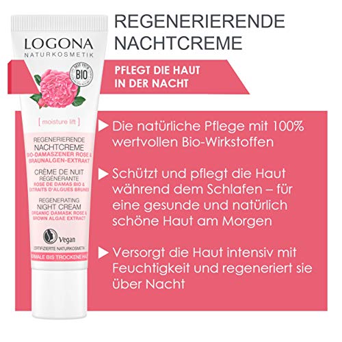 LOGONA Crema notte rigenerante con acqua di rosa, crema viso per la notte, idratazione intensa, anti invecchiamento, rosa damascata e burro di karité, serie idratante, vegano, naturale, 30 ml
