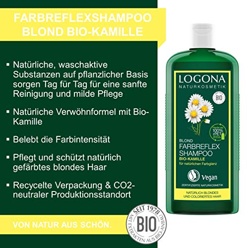 LOGONA Naturkosmetik Colorreflex Shampoo biondo per capelli naturalmente lucidi, adatto per capelli biondi e biondi, shampoo per capelli colorati con formula vegana in camomilla biologica, 1 x 250 ml