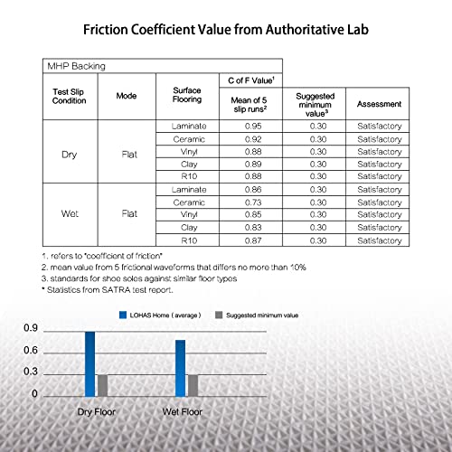 Supporto antiscivolo MHP aggiornato: testato e dimostrato da un laboratorio autorevole, con un coefficiente di attrito più elevato (C of F Value) rispetto agli standard per le suole delle scarpe. Aderisce al pavimento, rimane in posizione anche su PAVIMENTI BAGNATI.