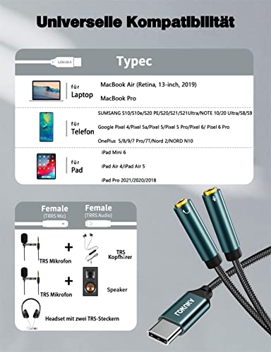 Splitter per microfono: l'adattatore jack USB C è un connettore USB-C maschio a due prese TRS da 3,5 mm, una presa per microfono e una per l'audio. È compatibile con un auricolare da gioco con due spine (con audio da 3,5 mm e connettori microfonici, non 2 cuffie), per collegarlo a un adattatore USB-C con jack audio e microfono. Passa il tuo smartphone USB-C, iPad, laptop a un auricolare da gioco con due connettori.