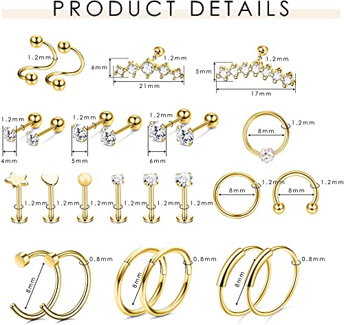 LOLIAS 25 PcS 16-20G Orecchino Cartilagineo in Acciaio Inossidabile a Cerchio per Donna CZ Star Heart Labret Trago Orecchino a Lobo Cartilagine Helix Orecchini a Cerchio Conch Piercing Gioielli