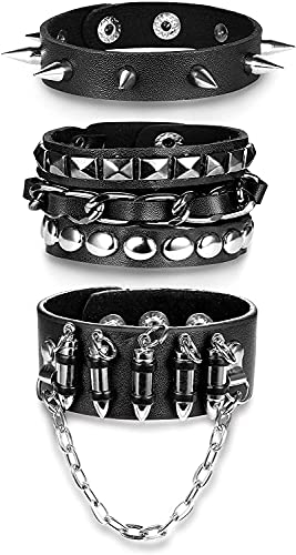 LOLIAS 3-5 Pezzi PU Catena Nera Bracciale in Pelle Punk Spike Borchie Punk Bangle Rock Bracciale Set per Uomo Donna Bracciale Appuntito Regolabile Regalo di Halloween