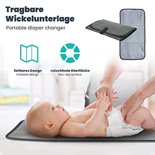 ✅: zaino fasciatoio grande (dimensioni (A/L): 34 x 30 x 15 cm), spallacci imbottiti regolabili, con materassino per il cambio (dimensioni: 58 x 30 cm).